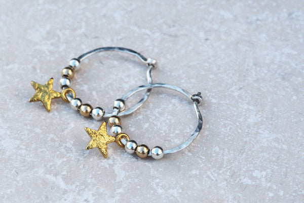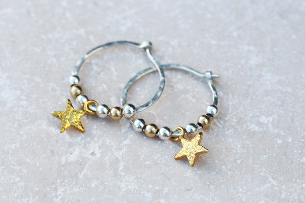 Small but perfectly formed hand hammered sterling silver hoops adorned with sterling and gold filled ball beads and textured gold vermeil star charm.