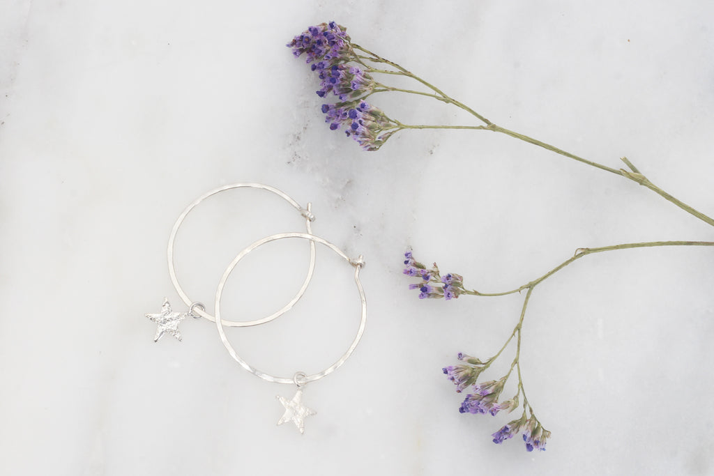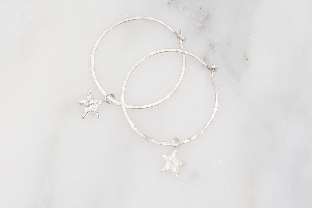 Hammered hoop earrings with detachable handmade textured star charms in gold vermeil or sterling silver.